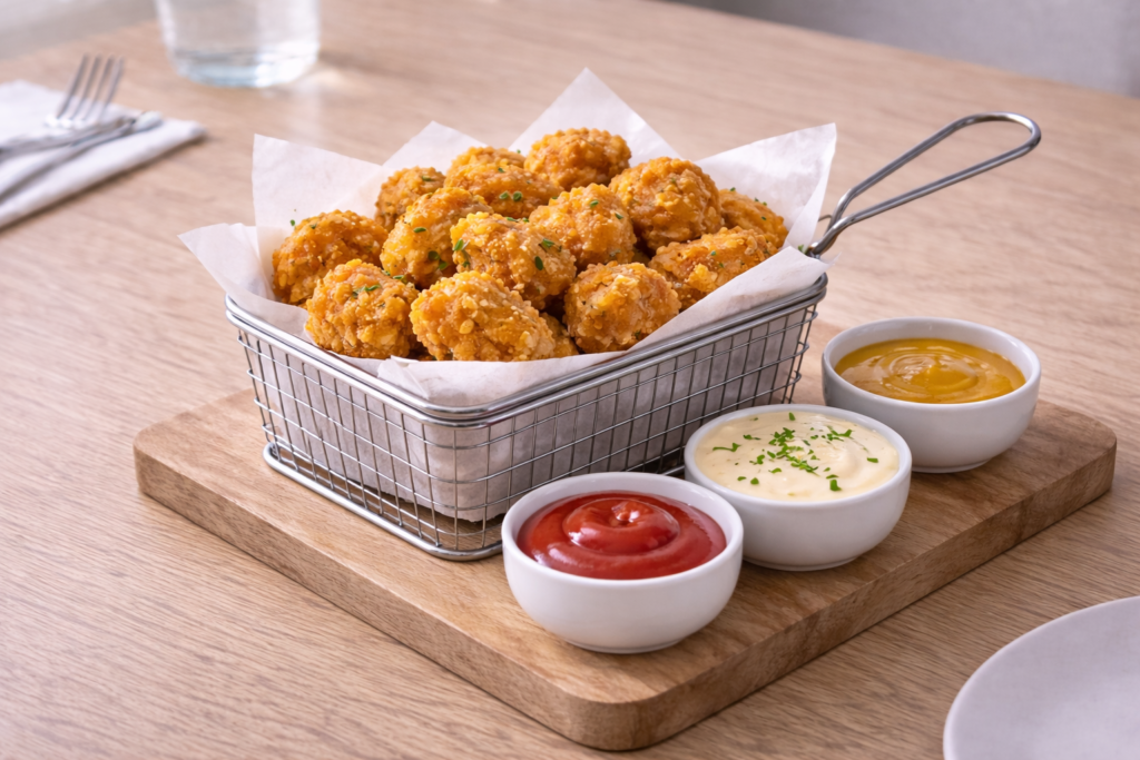 Warme Fingerfood-Optionen wie Chicken Nuggets, Käsebällchen, kleine Schnitzel,